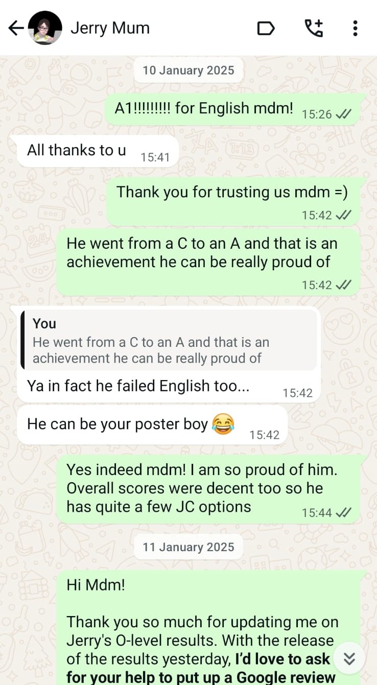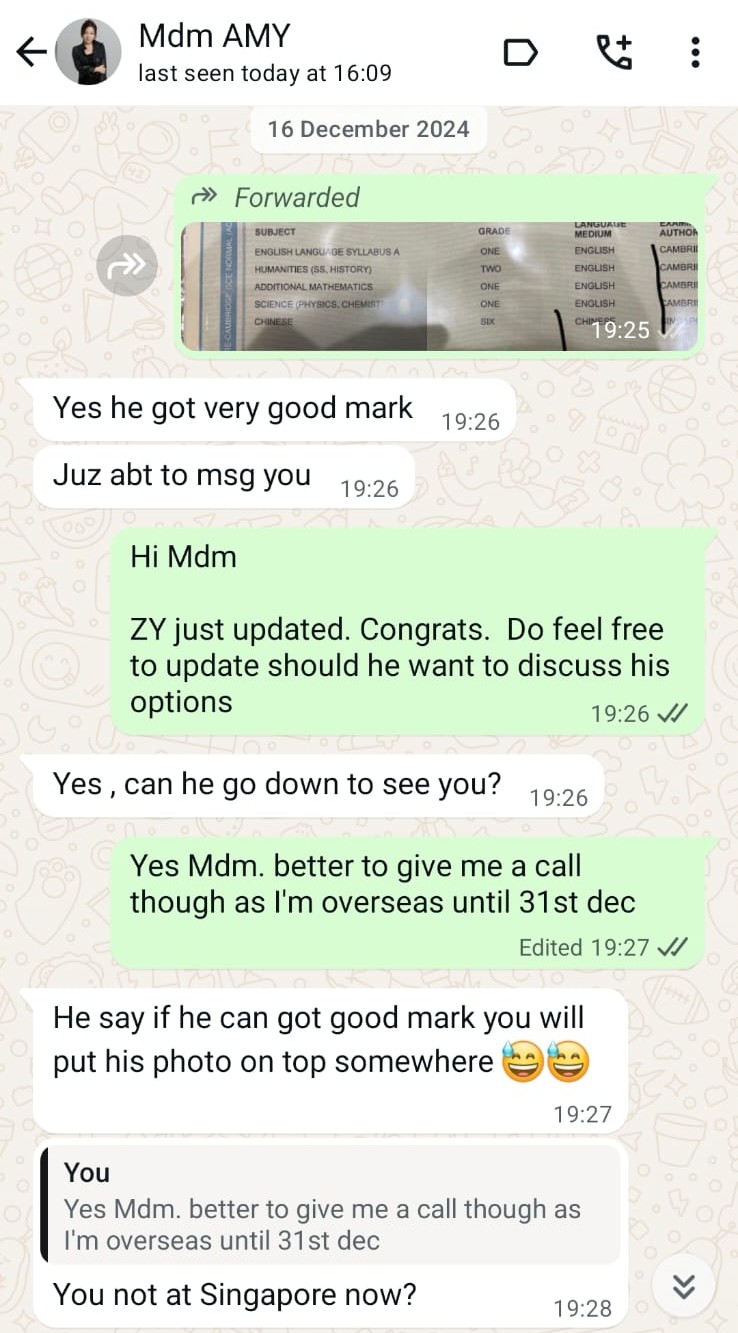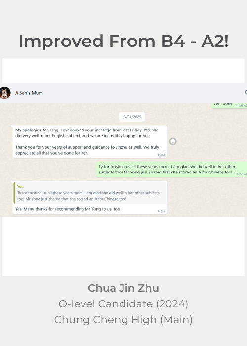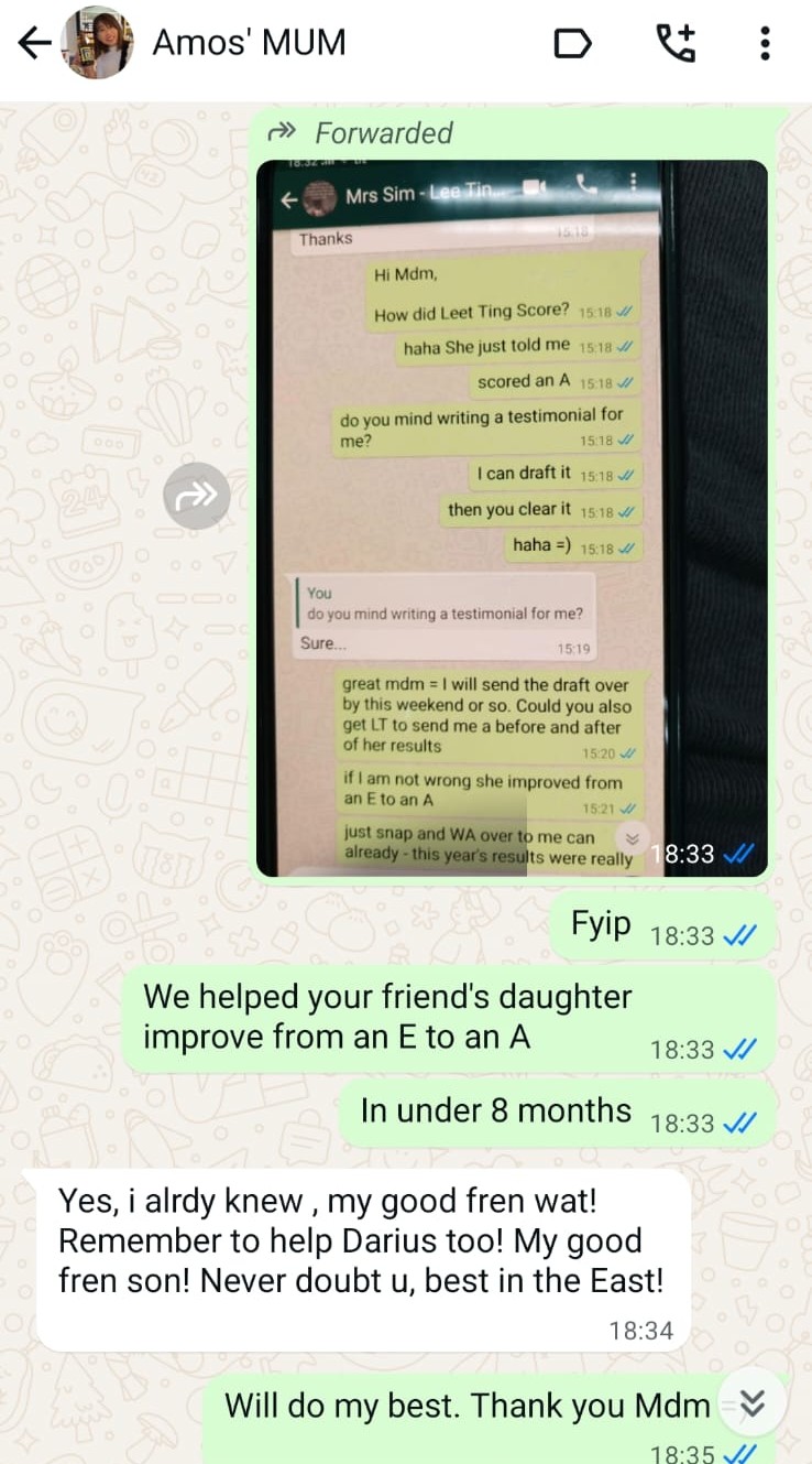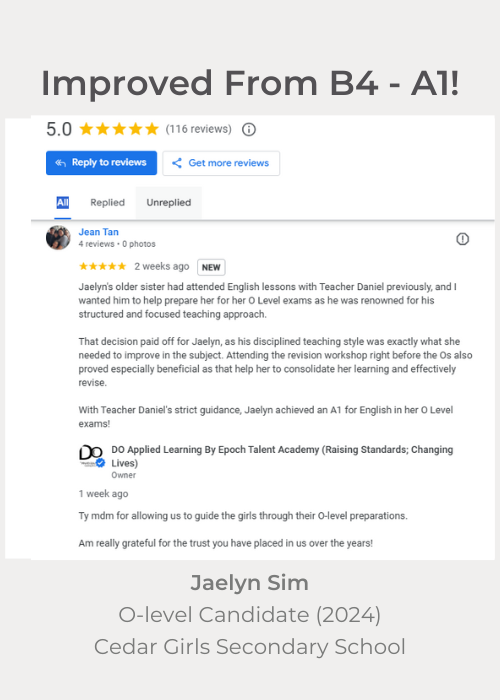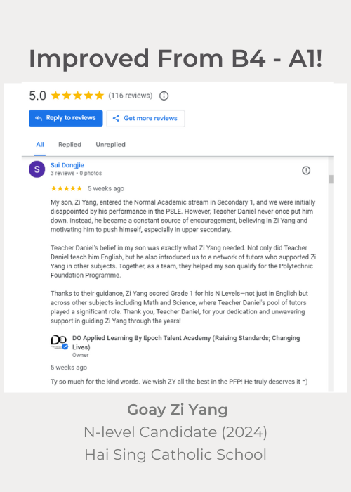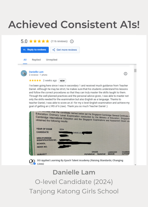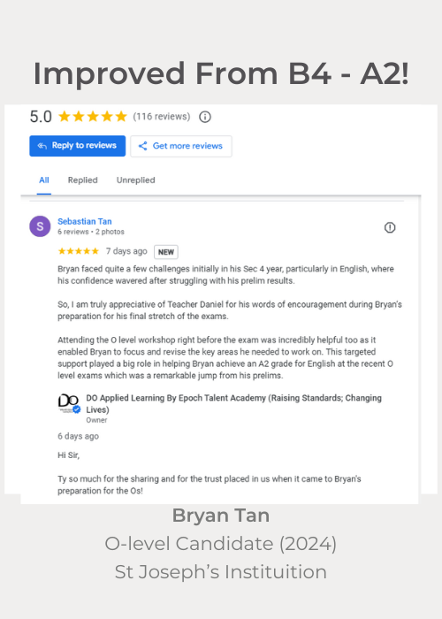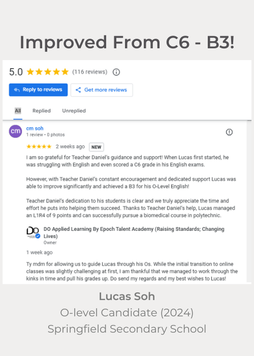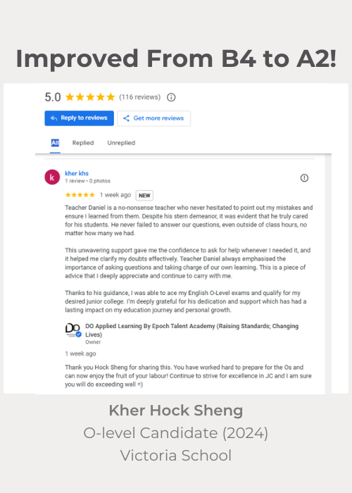 Teacher Daniel taught me from Pri 4 until Sec 4. Over the years in his class, I really appreciated how the application focused teaching methods taught by him enabled me to not only strengthen my language skills, but more importantly helped me to hone my critical thinking ability and communication skills. The skills I’ve learnt from him stayed with me even after I graduated from Secondary school, and were crucial for my successful scholarship application.
